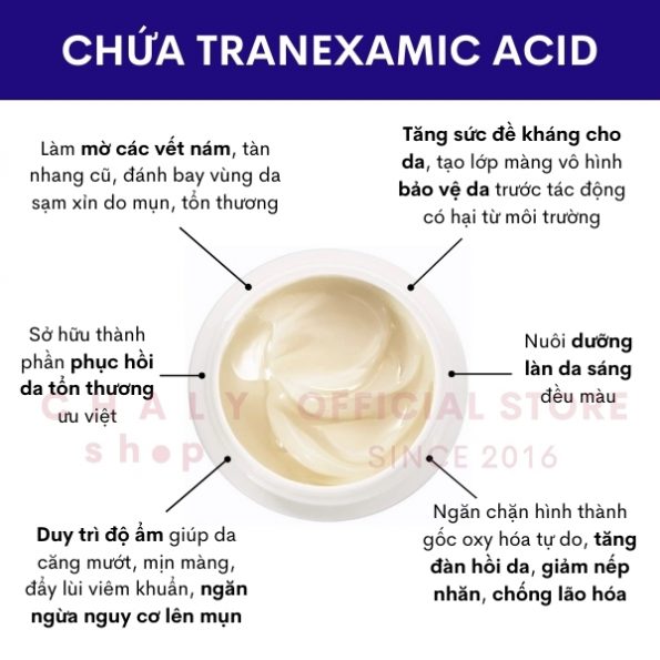 – Tranexamic acid cũng được biết tới với tác dụng làm chậm lại quá trình oxy hoá tế bào da hữu hiệu