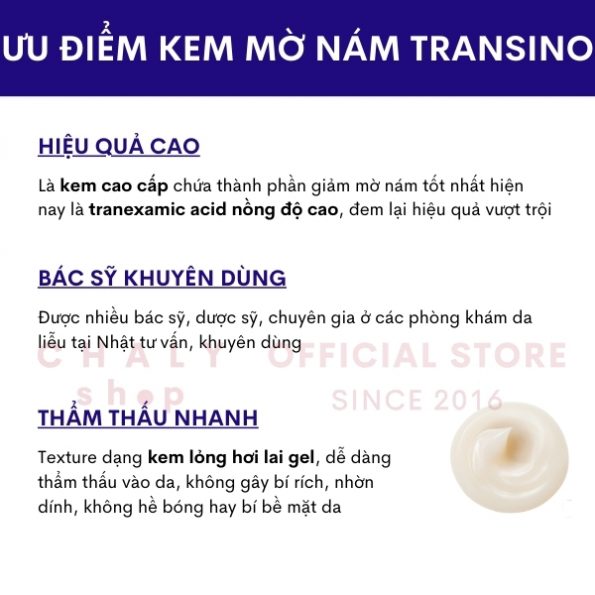 – Kem trị nám dưỡng trắng Transino Nhật tại Chaly đã về mẫu mới nhất. Sản phẩm luôn về mới liên tục, số lượng ít để khách hàng yên tâm tối đa khi sử dụng