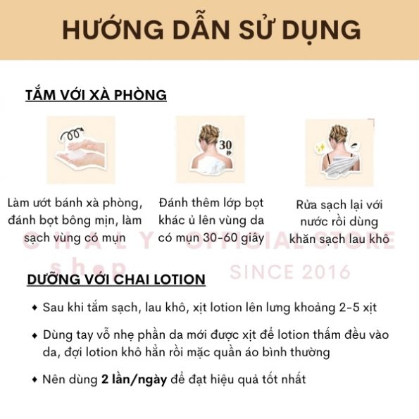 Hướng dẫn sử dụng thông dụng nhất là sau khi tắm lau người sau đó xịt lotion vào lưng, vỗ nhẹ, để khô một tí rồi mặc quần áo vào. Tuy nhiên gần đây mình thường dùng kiểu như toner, xịt một ít ra bông tẩy trang, thoa đều khắp phần lưng và ngực bị mụn rồi vỗ nhẹ để dưỡng chất hấp thu. Với mình cách này tiện, tiết kiệm và có vẻ hiệu quả hơn xịt khắp lưng rồi đợi khô như trước.
