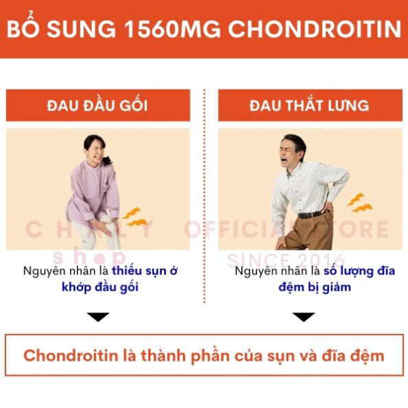 – Chondroitin được cơ thể tự sản sinh ra trước năm 20 tuổi. Tuy nhiên từ 20 tuổi trở đi thì cơ thể ngưng tự sản xuất thêm. Nếu không bổ sung từ bên ngoài để bồi đắp lượng chondroitin thiếu hụt, tình trạng vận động khó khăn, đau nhức cơ khớp sẽ càng ngày càng tăng thêm. Về lâu dài có thể dẫn tới viêm khớp, chấn thương khớp hoặc viêm bao hoạt dịch … – những bệnh lý về khớp nghiêm trọng hơn