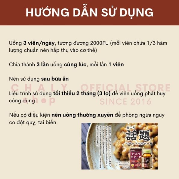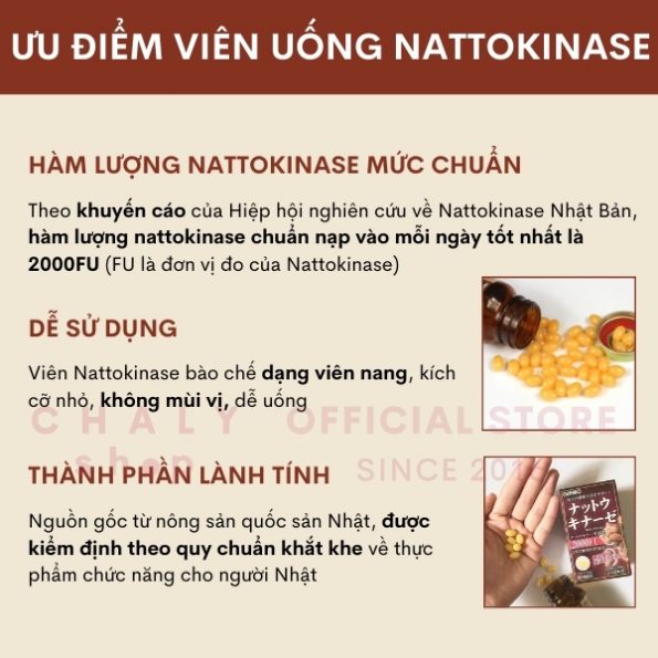 – Vậy bổ sung hàm lượng bao nhiêu nattokinase mỗi ngày là đủ? Theo khuyến cáo của Hiệp hội nghiên cứu về nattokinase Nhật Bản, hàm lượng nattokinase chuẩn nạp vào mỗi ngày tốt nhất là 2000FU (trong đó FU là đơn vị đo của nattokinase). Không phải cứ bổ sung càng nhiều càng tốt. Do đó, trừ phi có chỉ định riêng của bác sỹ, không nên tuỳ tiện sử dụng các viên uống Nattokinase 4000FU, 5000FU trên thị trường. Viên chống đột quỵ Nattokinase 2000FU Nhật Bản là lựa chọn tốt nhất vì cung cấp hàm lượng nattokinase chuẩn, tốt cho sức khoẻ, đồng thời được sản xuất bởi hãng thực phẩm chức năng số 1 tại Nhật là hãng Orihiro rất uy tín và lâu đời