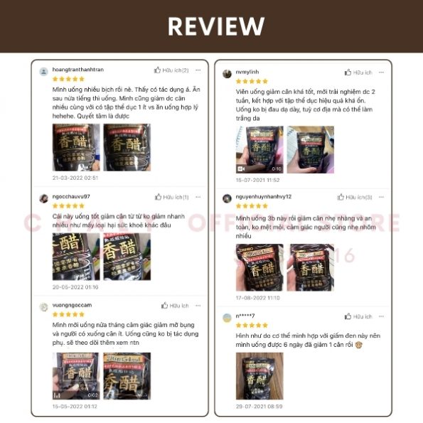 “Mình uống viên giảm cân từ giấm đen này đã hơn chục năm nay. Mục đích không phải chỉ là ổn định cân nặng, mà còn là chống lão hoá từ bên trong. Thay vì uống tảo, hay uống những viên chống lão hoá cụ thể nào đó giá cao, ví dụ như mấy viên collagen hay nhau thai này kia rất đắt, thì mình lựa chọn giấm đen cho rẻ, 1 túi uống được 2 tháng lận