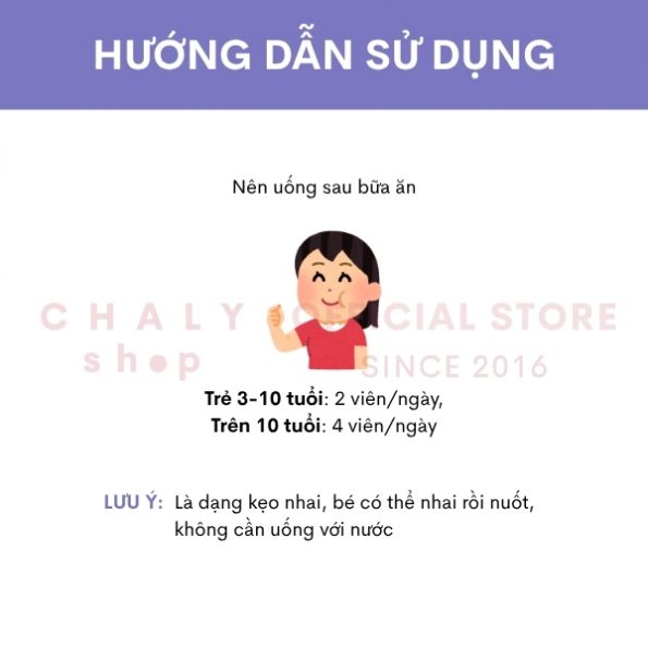 Hương vị thơm ngon, kích thích vị giác của trẻ, với thiết kế dạng viên kẹo, tan nhanh trong miệng, mang lại hiệu quả nhanh chóng, trẻ dễ nhai, dễ hấp thụ. Hiện Chaly có 2 loại gồm: Sắt + Folic Acid (túi tím) và Vitamin C (túi xanh)