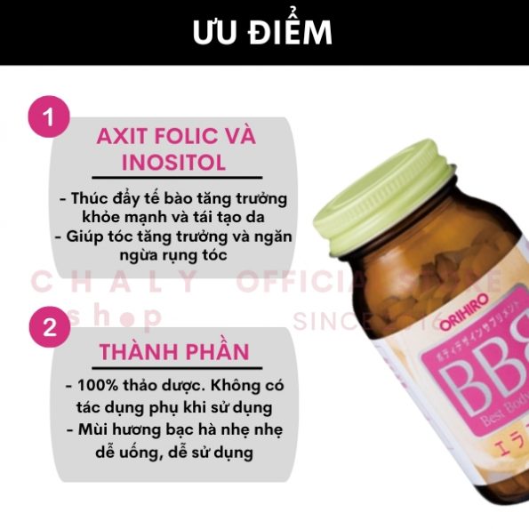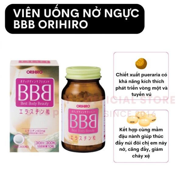 – Viên uống best body beauty BBB của Orihiro Nhật được thiết kế để bổ sung các thành phần hỗ trợ phát triển tuyến vú và bộ ngực, giúp kích cỡ vòng một phát triển tối đa, săn chắc, căng tròn ngay cả sau độ tuổi 18