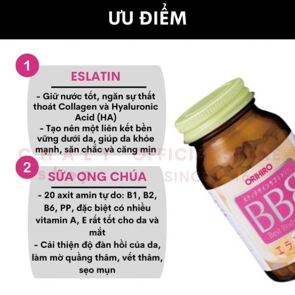 – Viên uống BBB bổ sung hàm lượng Elastin cao – có khả năng giữ nước tốt, ngăn sự thất thoát Collagen và Acid hyaluronic. Vì vậy, khi sử dụng viên uống sẽ giúp da luôn ẩm mịn, săn chắc
