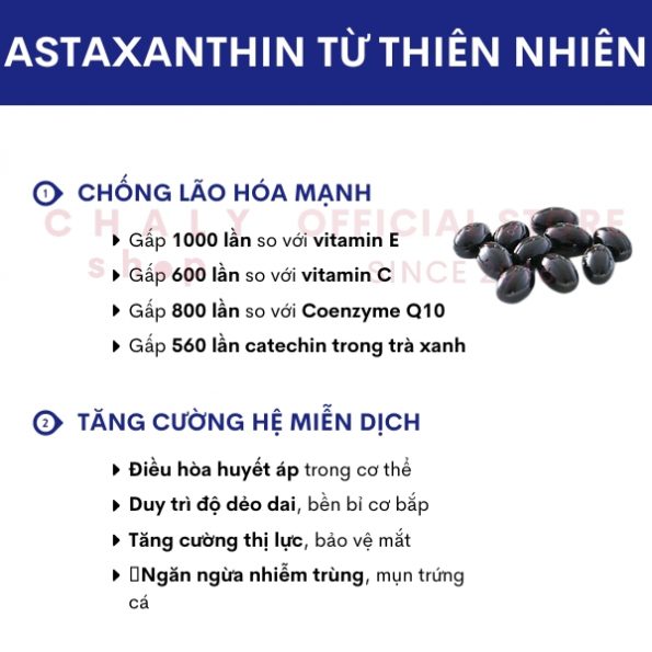 – Astaxanthin là một thành phần trong tự nhiên, có nguồn gốc chiết xuất từ thiên nhiên lành tính (thường là từ tôm cua, các loại tảo)