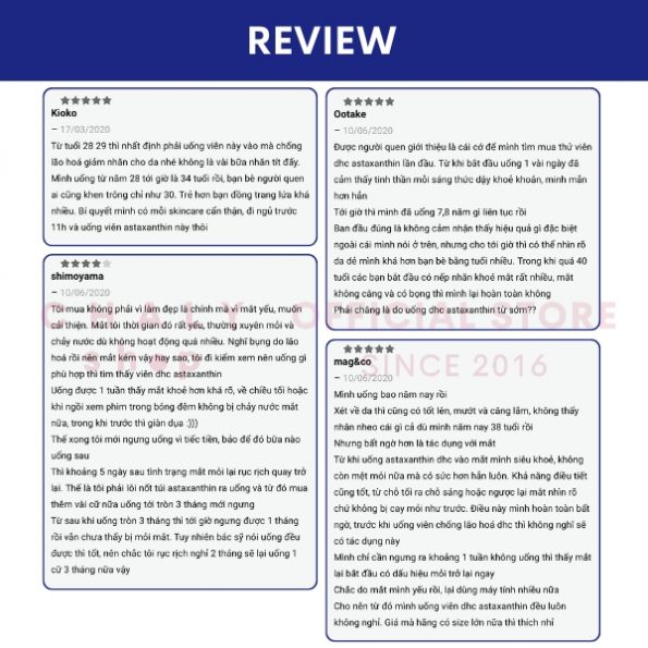 – Viên uống DHC chống lão hoá astaxanthin với hiệu quả ưu việt của mình được review cực cao trên chuyên trang Cosme Nhật Bản. DHC astaxanthin đạt số điểm tới 6.7 (trên điểm tối đa 7 điểm), xứng danh là viên uống chống lão hoá của Nhật mạnh nhất hiện nay