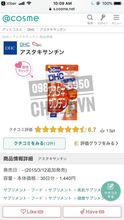 – DHC astaxanthin của Nhật review cao tới 6.7 (trên max 7 điểm) tại Cosme Nhật