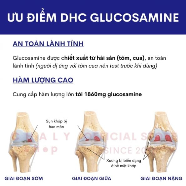 – Ưu điểm lớn của viên uống DHC glucosamine là cung cấp hàm lượng glucosamine lớn, lại có nguồn gốc tự nhiên khôg gây tác dụng phụ khi sử dụng