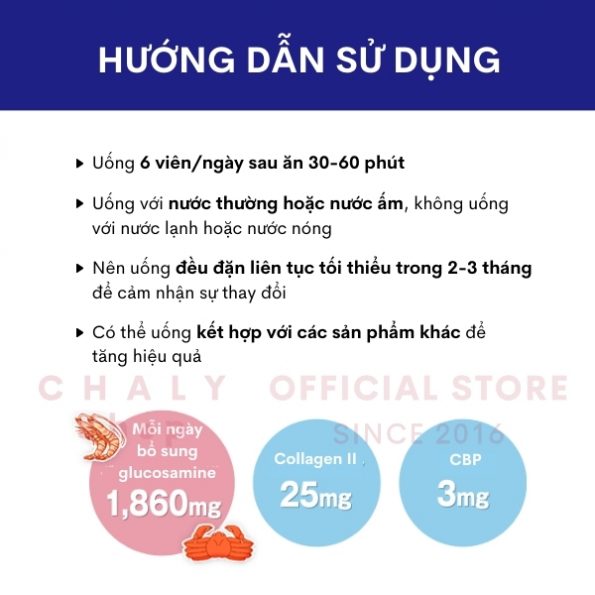 – Uống 6 viên glucosamine/ ngày, có thể chia 2-3 lần tuỳ theo