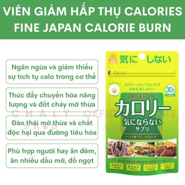 Viên uống chống hấp thụ calories Fine Japan Calorie Burn 150 viên Nhật là thực phẩm chức năng hỗ trợ giảm cân, sản xuất bởi thương hiệu Fine Japan – chuyên sản xuất các sản phẩm chăm sóc sức khỏe