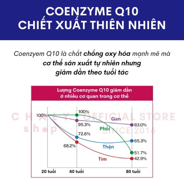 – Các công dụng chính của Coenzyme Q10 có thể kể đến gồm+ Xử lý các triệu chứng rối loạn và suy tim mãn tính+ Q10 rất hiệu quả trong việc phòng chống suy tim sung huyết, cơ tim, cao huyết áp, đau thắt ngực ổn định, rối loạn nhịp tâm thất, ung thư, bệnh nha chu, mệt mỏi mãn tính, chứng loạn dưỡng cơ và còn có tác dụng tăng cường sức khỏe+ Ngoài ra Q10 có tác dụng ngăn chặn tình trạng giảm trí nhớ và các chức năng nhận thức khác, chẳng hạn như khả năng tập trung.+ Đặc biệt dành cho các bệnh nhân có các vấn đề về tuần hoàn máu, tim mạch gây ứ, tắc, suy tim… làm ảnh hưởng tới quá trình trao đổi của hệ tuần hoàn, khiến cơ thể yếu mệt, già trước tuổi+ Nhờ đặc tính chống lão hoá mạnh mẽ mà Coenzyme Q10 được sử dụng nhiều trong các sản phẩm chăm sóc da, cả mỹ phẩm và thực phẩm chức năng để duy trì làn da và cơ thể khoẻ mạnh, trẻ trung+ Q10 có tác dụng ngăn ngừa sự hình thành của các gốc tự do được tạo ra trong cơ thể (là nguyên nhân gây ra các bệnh thoái hóa, môi trường ô nhiễm, tia cực tím… tất cả những điều đó làm cho collagen và elastin trong cơ thể bị suy giảm, gây ra các nếp nhăn trên da và hiện tượng chẻ ngọn ở tóc, khô và xước các đầu móng tay…)+ Bổ sung đủ Coenzyme Q10 đều đặn giúp cho da, tóc, móng được cung cấp đủ dưỡng chất, từ đó loại trừ các gốc tự do trong cơ thể, góp phần đẩy lùi lão hoá, giảm nếp nhăn, duy trì nét thành xuân dài lâu
