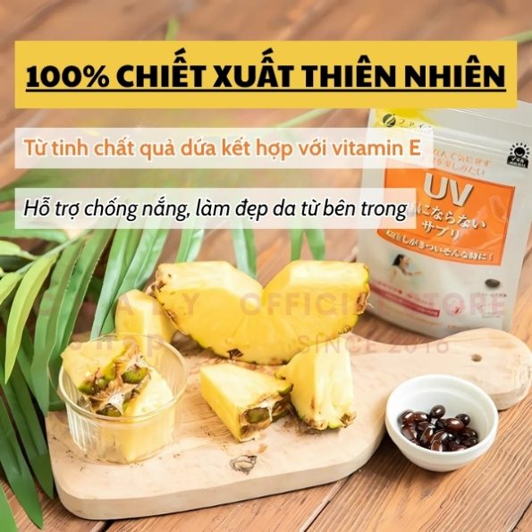 Với thành phần chính gồm chiết xuất từ quả dứa chứa hàm lượng cao vitamin C, kết hợp cùng nguồn vitamin E dồi dào, sử dụng viên uống chống nắng hàng ngày Fine của Nhật vừa giúp tăng cường khả năng tự bảo vệ trước tia cực tím của da, vừa ngăn ngừa nguy cơ nám, tàn nhang, sạm da hay bỏng nắng, đồng thời chống lão hoá và dưỡng trắng từ bên trong hiệu quả