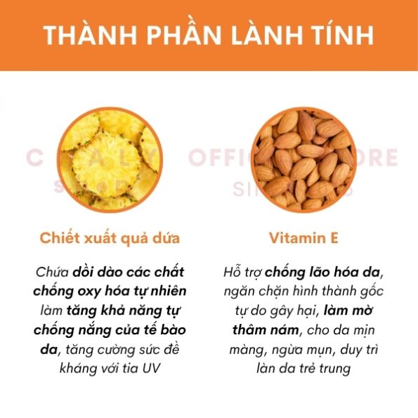 Thành phần chính là chiết xuất trái dứa giúp tăng sức đề kháng của da trước tia UV, bảo vệ da khỏi ánh nắng