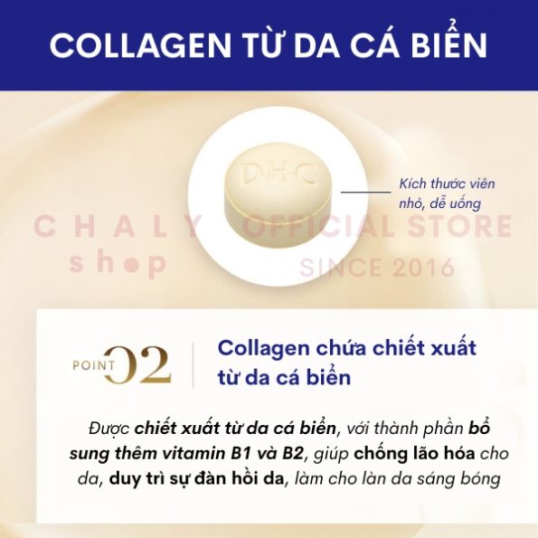 – Viên uống bổ sung collagen của DHC Nhật Bản cung cấp cho cơ thể lượng collagen tương đương 2.050mg collagen peptide mỗi ngày. Nguồn collagen của viên uống DHC được chiết xuất từ cá – gọi là collagen fish – ít chất béo, ít calorie không gây tăng cân, ngược lại có ưu điểm được cơ thể dễ dàng hấp thu, do đó phát huy tác dụng nhanh hơn các loại collagen khác