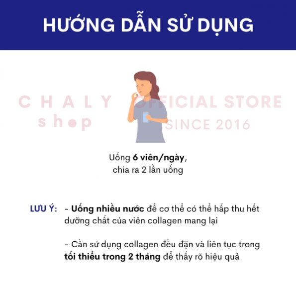 – Uống 6 viên collagen/ ngày, chia làm 2 lần. Nên uống cùng 1 ly nước lớn