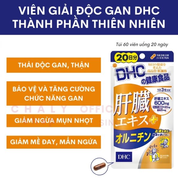 Thành phần chiết xuất từ gan heo tươi theo công thức riêng của DHC, cùng ornithine, thuốc hỗ trợ gan của Nhật DHC giúp cơ thể nhẹ nhõm mỗi ngày, cải thiện nhiều hiện tượng về da dẻ như nhiều mụn nhọt, mề đay, mẩn ngứa dị ứng, nóng trong … đặc biệt là ở người hay uống bia rượu