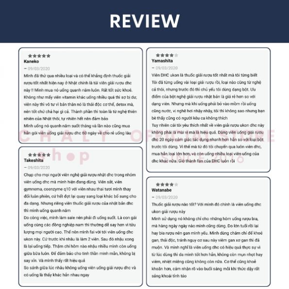 Mình đã thử qua nhiều loại và có thể khẳng định thuốc giải rượu tốt nhất hiện nay ở Nhật chính là túi viên giải rượu dhc này !! Mình mua nó uống quanh năm luôn. Rất tốt sức khoẻ. Không như mấy viên vitamin khác uống nhiều quá thì sợ bị dư, viên này thì vô tư vì bản thân nó là thải độc cơ thể, detox mà, nên tốt chứ chả hại gì cả. Thành phần thì toàn là từ nghệ thiên nhiên của Nhật thôi, tự nhiên hết nên đảm bảo