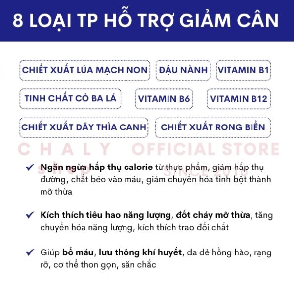 – Trong đó có thể kể tới chiết xuất từ rong biển, chiết xuất dây thìa canh gymnema, tinh chất cỏ ba lá, chiết xuất lúa mạch non, đậu nành … cùng hàng loạt vitamin nhóm B từ B1, B12, B6 … rất đa dạng