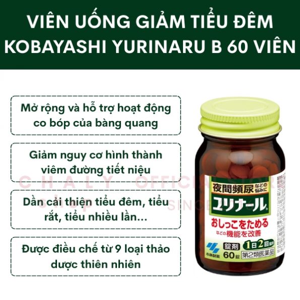 Viên uống giảm tiểu đêm Kobayashi Pharmaceutical Yurinaru B 60 viên Nhật là viên uống hỗ trợ giảm tiểu đêm, tiểu nhiều lần, tiểu không hết nước, tiểu buốt, tiểu rắt, ngăn ngừa bệnh viêm đường tiết niệu hay sỏi thận dựa trên cơ chế co bóp và mở rộng bàng quang đẩy hết nước tiểu ra ngoài