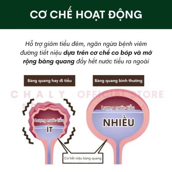 – Là viên uống hỗ trợ giảm tiểu đêm, tiểu nhiều lần, tiểu không hết nước, tiểu buốt, tiểu rắt, ngăn ngừa bệnh viêm đường tiết niệu hay sỏi thận dựa trên cơ chế co bóp và mở rộng bàng quang đẩy hết nước tiểu ra ngoài