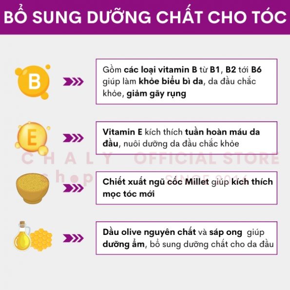 – Sản phẩm bổ sung rất nhiều dưỡng chất cần thiết cho sự phát triển khoẻ mạnh của da đầu, kích thích nang chân tóc, giúp tóc mọc nhanh