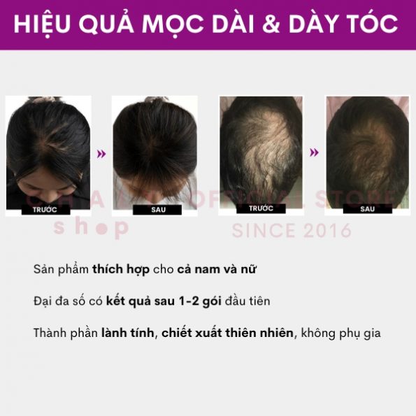 Tôi uống 1 gói đầu tiên đã thấy tác dụng tốt rồi. Tóc giảm rụng hẳn. Chỗ bên mái thưa tóc mọc ra nhiều hơn, bắt đầu nhìn đầy đặn. Tác dụng tới với mình nhanh cũng có thể bởi vì mình dùng thêm luôn cả chai xịt. Đằng nào cũng 1 công nên mình dùng luôn cho hiệu quả nhanh hết sức có thể. Ai ngờ nó nhanh thật =))))