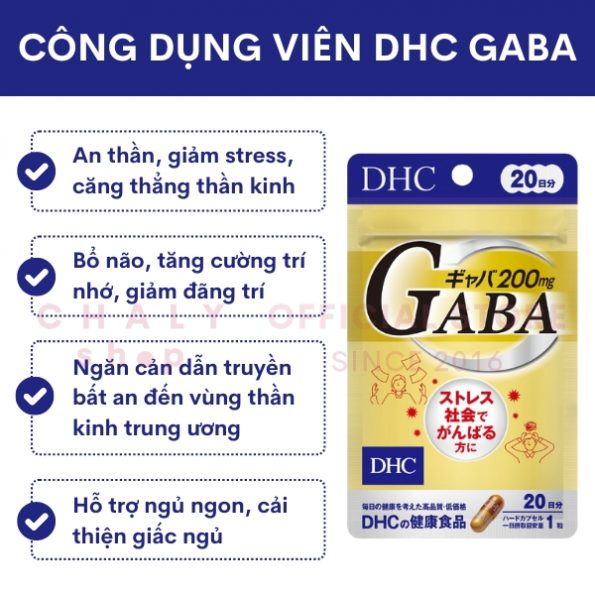 Viên uống bổ não, giảm căng thẳng, stress GABA DHC Nhật có thành phần chính gồm GABA có tác dụng chung là giải toả căng thẳng thần kinh, giúp bổ não, tăng cường lưu thông máu, tốt cho trí nhớ, giảm stress