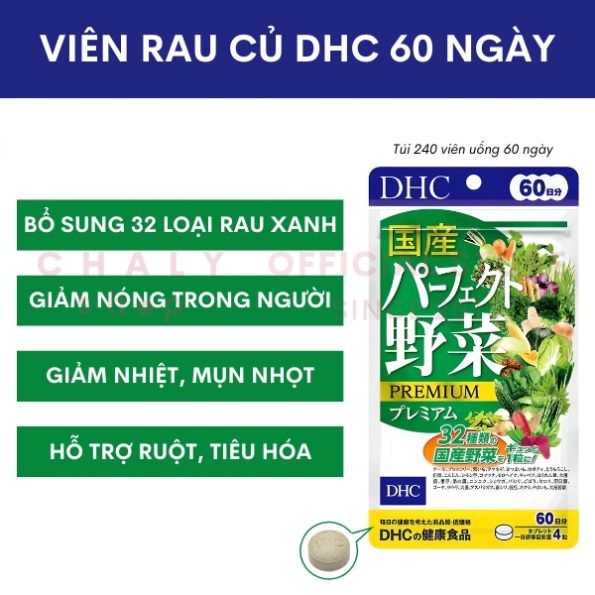 Viên uống DHC rau củ 60 ngày Premium Yasai Nhật Bản gọi tắt là viên rau DHC của Nhật, là viên uống chức năng nổi tiếng có thành phần chiết xuất từ 32 loại rau củ quả xanh khác nhau của Nhật Bản, giúp bổ sung lượng lớn chất xơ, vitamin, khoáng và các amino cần thiết cho hoạt động thể chất khoẻ mạnh của cơ thể