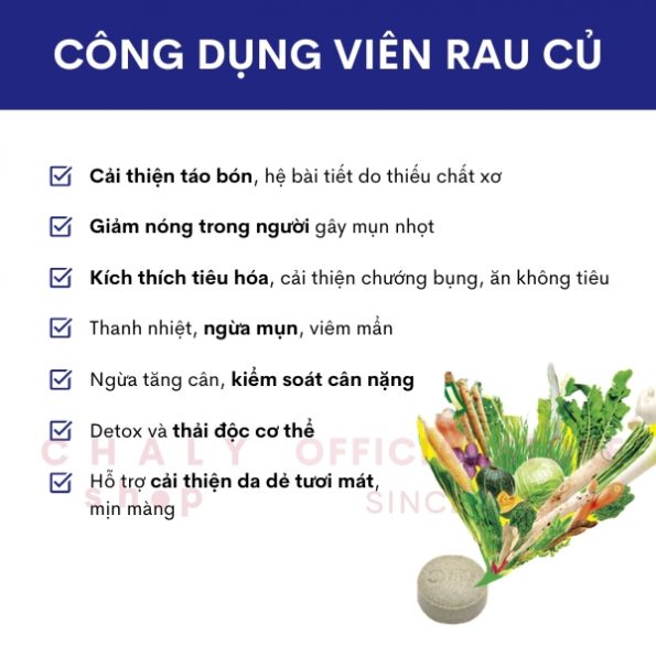 – Mục đích sử dụng: Bổ sung rau củ tổng hợp. Cung cấp nguồn lớn vitamin, khoáng, chất xơ cho cơ thể. Cải thiện các vấn đề sức khỏe liên quan đến thiếu rau như táo bón, nóng trong, mụn nhọt