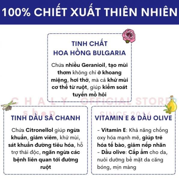 Kết hợp cùng Vitamin E và dầu olive – có hiệu quả khử mùi và tạo mùi thơm cơ thể, duy trì mùi thơm khoang miệng giúp chị em có nét quyến rũ và tự tin riêng