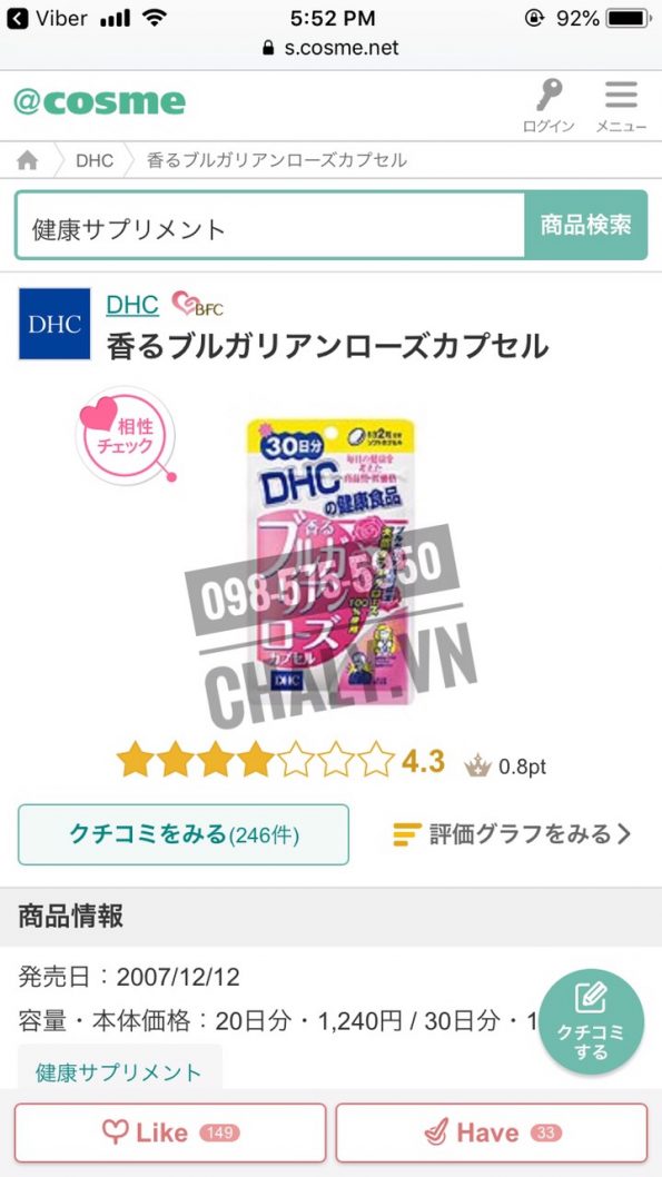 Viên uống hoa hồng Nhật Bản được chị em tại Nhật rất yêu thích, review 4.3 trên Cosme Ranking. Đây luôn là một trong những viên uống DHC bán chạy nhất