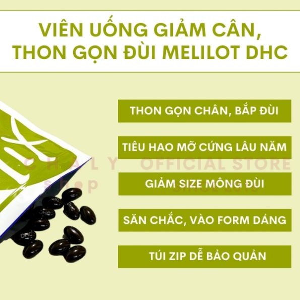 Viên uống thon gọn đùi Melilot của DHC Nhật Bản có thành phần chính là melilot extract, cùng với một loạt thành phần chiết xuất khác như ớt, tiêu đen, cỏ ba lá, lá cây bạch quả, bột trà xanh ... có tác dụng kích thích đốt mỡ, làm săn chắc vùng mông, đùi, bắp chân – những nơi thường tập trung mỡ trắng cứng lâu năm