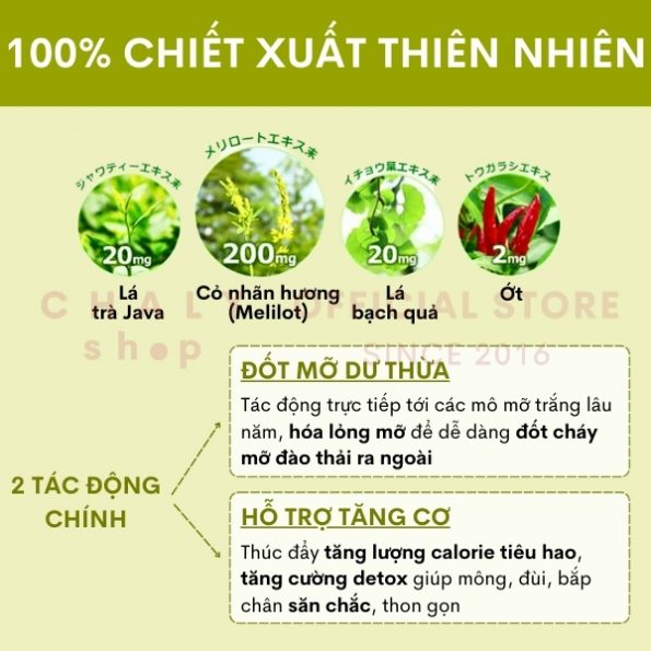 Đây không phải là thuốc giảm cân , không làm mất lượng nước trong người bạn và được chiết xuất từ thiên nhiên , chủ yếu từ trà xanh nên không gây mệt mỏi , hạn chế được tác dụng phụ , mà cũng không thể giảm đùi được nếu không kết hợp tập gym