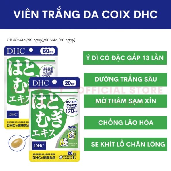 đều có công dụng tốt với các vùng da sạm, thâm, đen, xỉn màu. Nhờ 2 thành phần này mà viên uống trắng da coix extract DHC của Nhật có khả năng làm sáng lại các vùng da thâm, sạm (do mụn hoặc do ánh nắng, do lão hoá), làm trắng vùng da thâm đen, dưỡng da dần trở nên trong suốt, có độ bóng mịn, trẻ trung không còn sạm xỉn