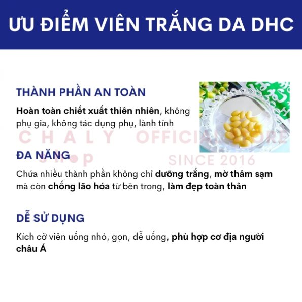 – Sản phẩm viên uống trắng da DHC Nhật Bản chứa nhiều thành phần không chỉ dưỡng trắng, làm mờ thâm sạm mà còn chống lão hoá từ bên trong, dưỡng đẹp toàn thân