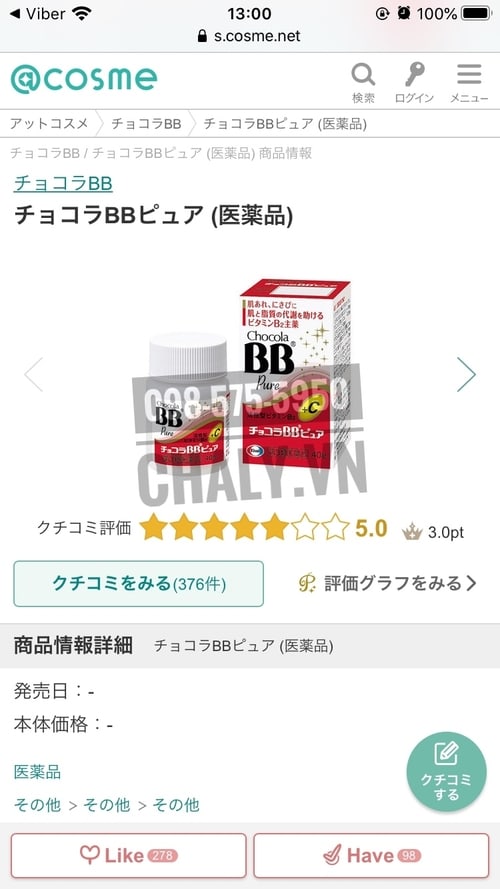Thuốc viên trị mụn, nám tàn nhang BB chocola pure 170v (チョコラBBピュア) của Nhật đạt số điểm review và lượt đánh giá cao trên Cosme Ranking Nhật