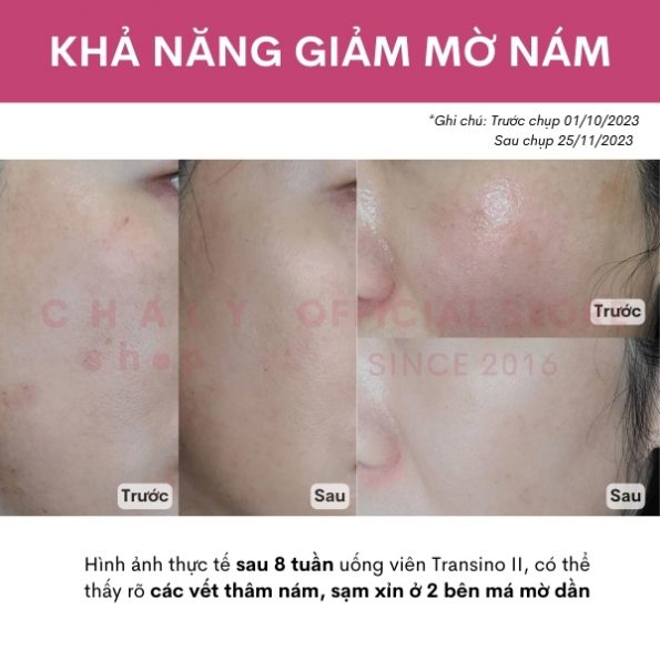 – Với một liệu trình uống trong 8 tuần (60 ngày), viên nám Transino II Nhật Bản được đánh giá là đem lại hiệu quả rất rõ rệt, gần như khác hoàn toàn với các loại viên uống giảm nám khác trên thị trường