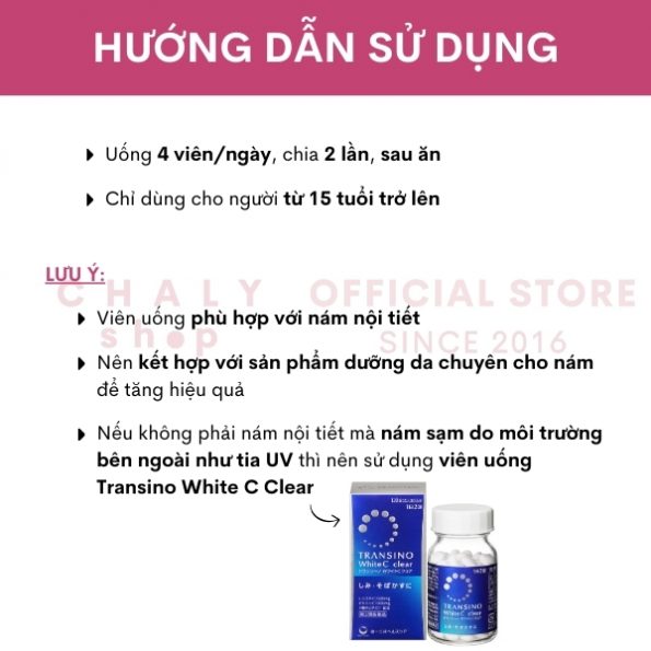 – Uống 4 viên cải thiện nám da Transino của Nhật/ngày, chia làm 2 lần sau bữa ăn