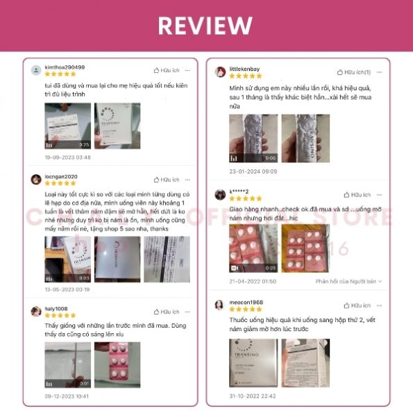 Chị mình uống viên này thì bị nôn nao trong người bảo là khó chịu nên đưa sang cho mình uống. Mình cũng có ít nám nhẹ ở gần mắt nên uống thử luôn xem thế nào. Hết 1 hộp thấy nám mờ gần như không còn thấy nữa (nám mình là nám nhẹ), da những vùng khác trắng hơn. Muốn uống thêm nhưng nghe shop khuyên transino chỉ uống 1 hộp chứ không nên lạm dụng liên tục nên mình ngưng