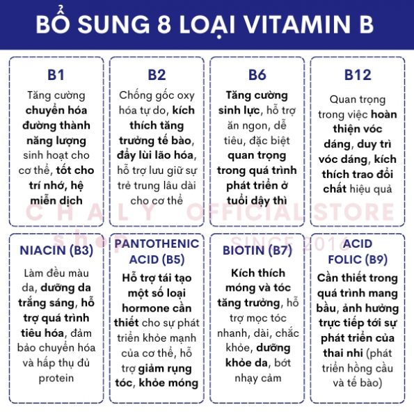 – Mục đích sử dụng: Bổ sung đa dạng các loại vitamin B, giúp cải thiện nhiều vấn đề sức khoẻ và da dẻ đa dạng như da xám xịt thiếu sức sống, tuần hoàn máu kém, tóc rụng thưa, móng tay gãy yếu …