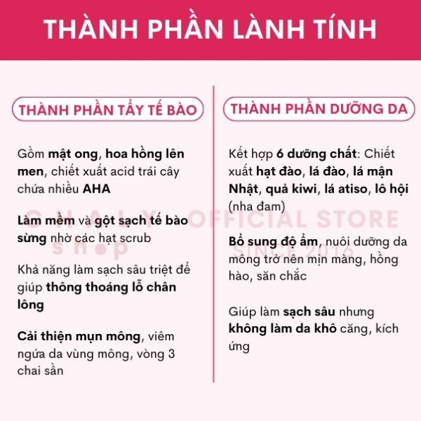 – Các thành phần này thẩm thấu sâu, không chỉ bổ sung độ ẩm và còn có tác dụng nuôi dưỡng da mông trở nên mịn màng, hồng hào, săn chắc hơn