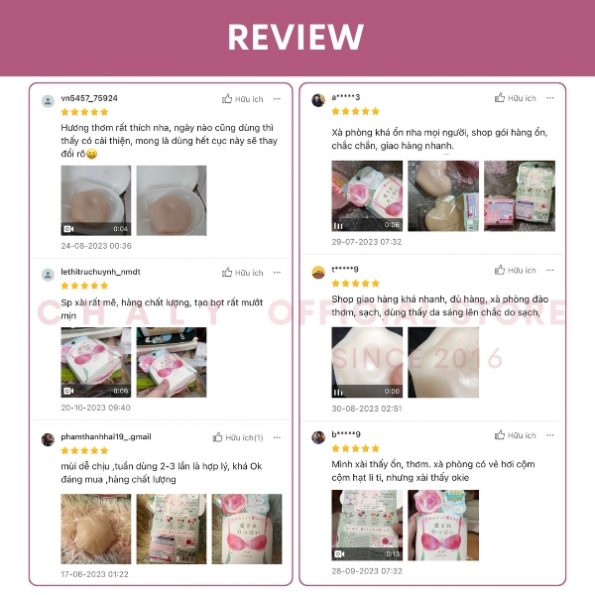 “Cục xà phòng hình hoa cưng xỉu, mùi rất thơm. Dùng được gần tháng, có trắng lên từ từ 1 chút, mình bị thâm nhiều nên cải thiện nhiu đó mình cũng thấy ổn rồi. mình sẽ kiên trì dùng thêm dài dài”