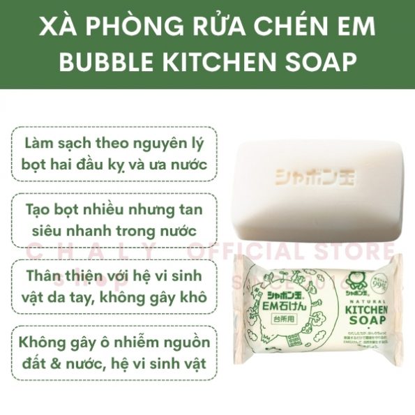 Xà phòng rửa chén Bubble Soap EM Kitchen Soap 110g Nhật Bản là xà bông tự nhiên được sản xuất theo công nghệ EM, khác với nước rửa chén công nghiệp chứa hàng loạt các loại hóa chất