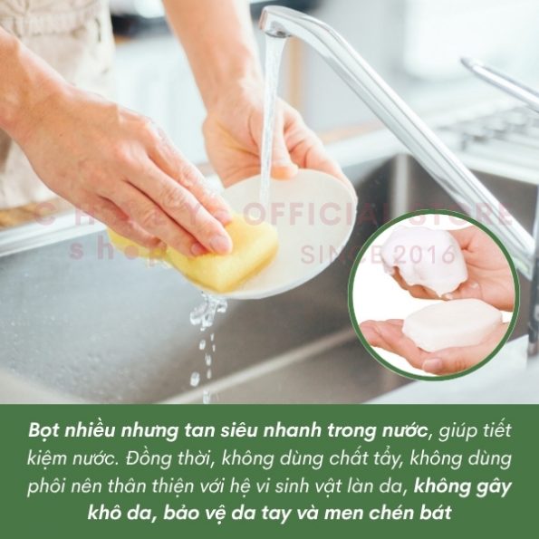 – Bọt xà bông tự nhiên rất nhiều nhưng tan siêu nhanh trong nước, giúp tiết kiệm nước so với nước rửa chén công nghiệp