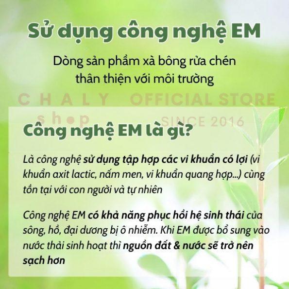 – Nhờ sử dụng công nghệ EM, xà bông rửa chén thân thiện nguồn đất & nước, hệ vi sinh vật, hệ thuỷ sinh trong đất và ao hồ, sông suối…