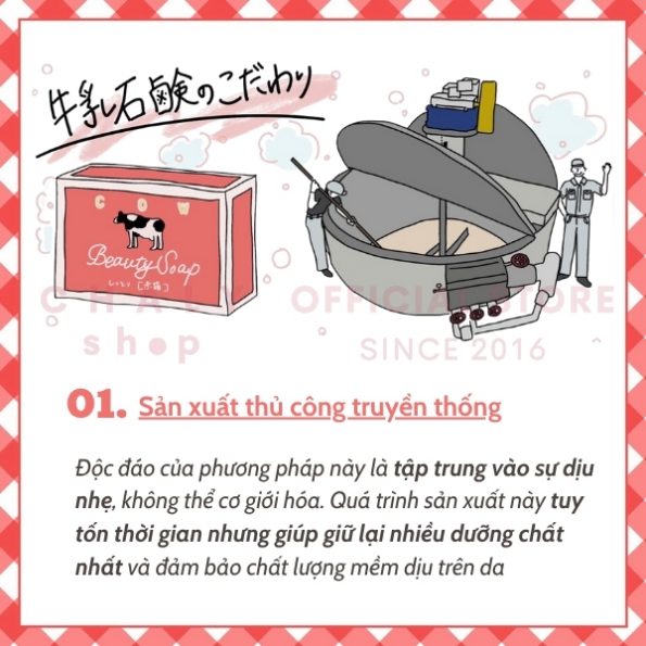 – Điểm độc đáo khác với các loại xà phòng trên thị thường khác, xà phòng chiết xuất sữa bò tươi Cow Soap Nhật được sản xuất bằng phương pháp thủ công truyền thống
