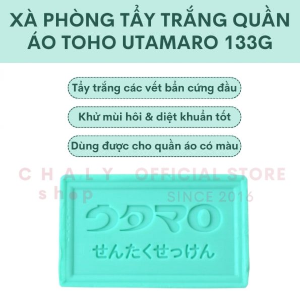Xà phòng tẩy trắng quần áo Toho Utamaro Soap 133g Nhật là sản phẩm tẩy sạch vết bẩn cứng đầu, giúp làm trắng quần áo, ngăn ngừa và tiêu diệt vi khuẩn gây bệnh, khử mùi hôi, cho quần áo thơm tho, sạch sẽ