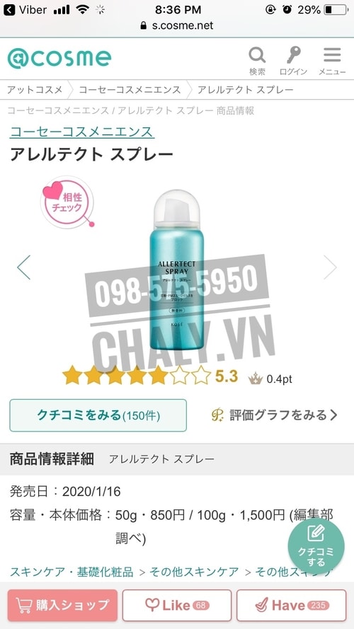 Được sản xuất bởi hãng mỹ phẩm Kose cực lớn ở Nhật, xịt allertect spray giữ vị trí cao trên chuyên trang review mỹ phẩm Cosme Ranking