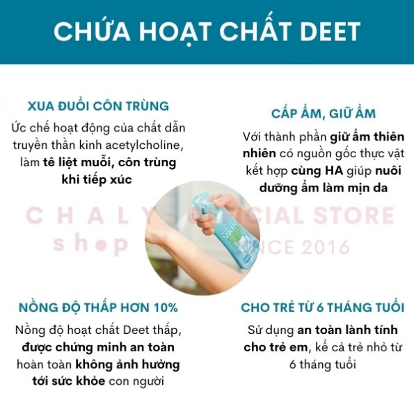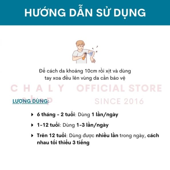 – Mục đích sử dụng: Ngăn ngừa muỗi dĩn bọ, côn trùng đốt. Dùng cho trẻ từ 6 tháng tuổi